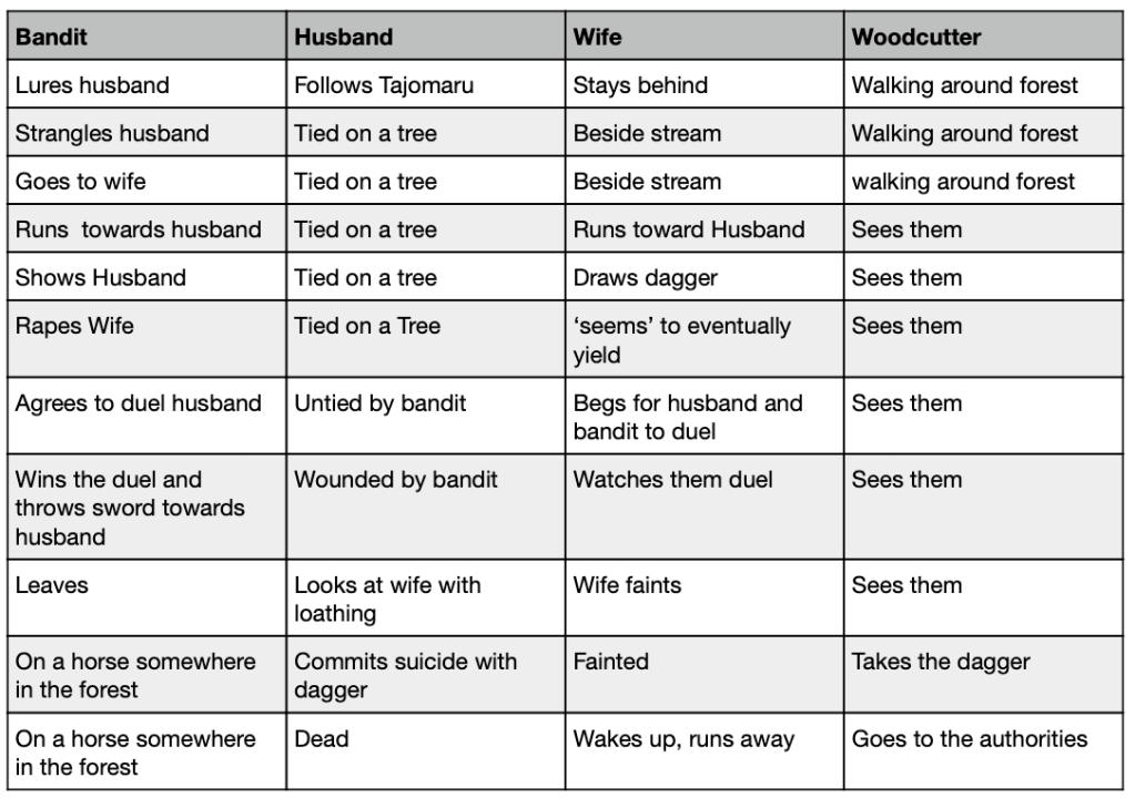 Egotism and pride fueled the inconsistencies in the narrative which reveal more about their characterization and not the actual events. No one in the film shifts the blame – each one admitting accountability to the murder and trying to put themselves in the best possible light. The wife thinks that killing her husband would preserve her virtue, the husband gave one last attempt to maintain his dignity by suicide, and the bandit maintaining his notriety. But then comes the interruption of the last testimony, the woodcutter’s. I believe he has a pivotal role in the crime or that he has a self-serving agenda like concealing the fact that he stole the dagger. The fact that it is unresolved is the functional core of the film. Viewers could analyze the cues given by Kurosawa such as camera angles, lighting, length of statements, and body language. Kurosawa’s adaptation could either be a homage of a rebellion against Akutagawa’s withholding of a resolution. I found a valuable academic article about this by Redfern, which I will reference below. Here is my attempt at tabulating the events that transpired.